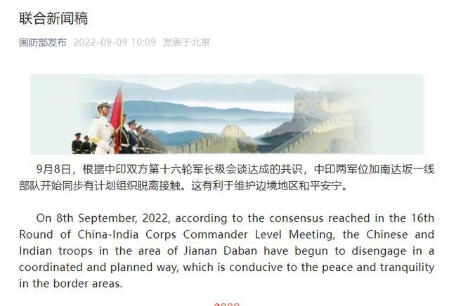 中印两国当天共同发布联合新闻稿宣布了此消息。联合新闻稿表示,根据中印双方第十六轮军长级会谈达成的共识,中印两军位加南达坂一线部队开始同步有计划组织脱离接触。这有利于维护边境地区和平安宁。