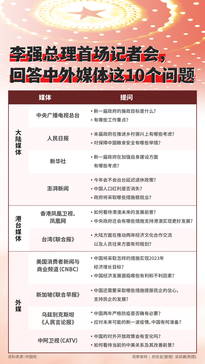 在近90分钟的时间里,李强总理共回答了中外媒体的10个问题。观察者网注意到,获得提问机会的10家媒体当中,有4家大陆媒体、2家港台媒体和4家外媒。
