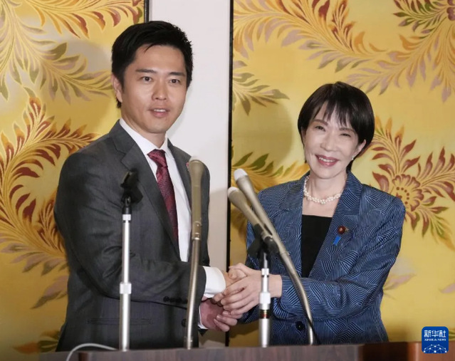 高市早苗(右)与维新会党首吉村洋文在记者会上握手。图源:新华社