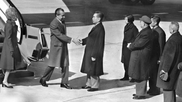 1972年2月21日,尼克松抵达中国的第一天,刚下飞机就留下历史性一幕:周恩来亲到机场迎接,两人紧紧握手,足有一分多钟。“总统先生,你把手伸过了世界最辽阔的海洋来和我握手。”周恩来说。