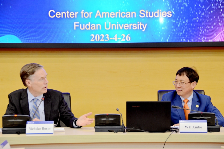 Ambassador of the U.S. to China Nicholas Burns talks with Wu Xinbo, Dean of the Institute of International Studies and Director at the Center for American Studies at Shanghai’s Fudan University, and other members of faculty and students at the center in Shanghai on April 26 (COURTESY PHOTO)