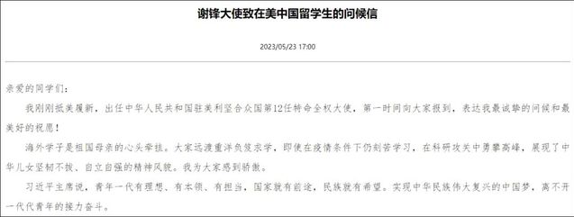 其次,作为中国派驻美国的使者,他还有一个重要任务就是跟对方增加交流,推动两国的合作,所以谢锋大使用了“重要使命”四个字。