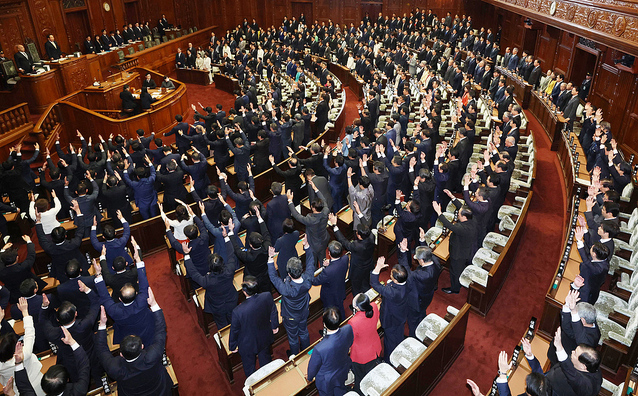 23日,日本东京,国会大厦,日本众议院解散,众议院议员按惯例欢呼。图源:视觉中国