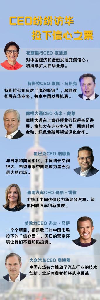范洁恩访华之前,包括特斯拉CEO马斯克、摩根大通CEO杰米·戴蒙、星巴克CEO拉克斯曼·纳拉辛汉(纳思瀚)等在内的多位海外跨国企业高管接连访华,纷纷以实际行动表明对中国市场机遇的高度重视,为中国经济投下信心之票。
