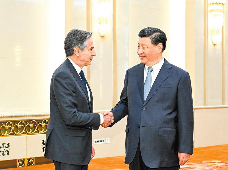 President Xi Jinping meets with visiting United States Secretary of State Antony Blinken at the Great Hall of the People in Beijing on Monday. LI XUEREN / XINHUA
