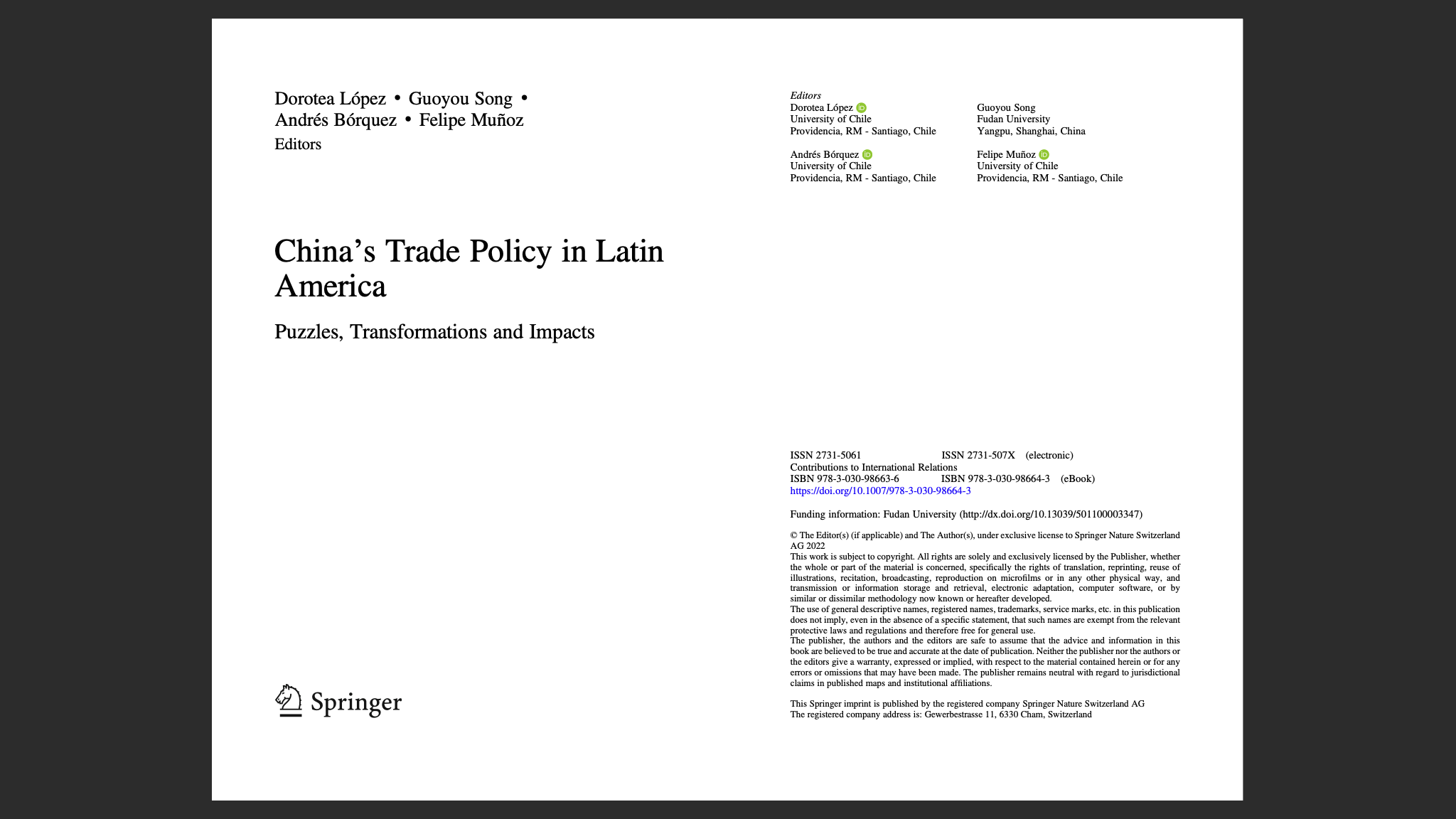 Dorotea López, Guoyou Song, China’s Trade Policy in Latin America: Puzzles, Transformations and Impacts, Springer, 2022, ISBN 978-3-030-98663-6