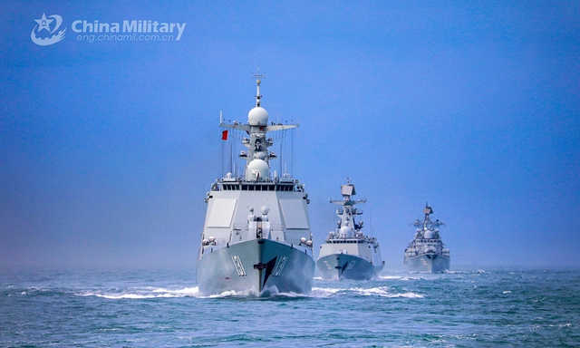 A naval fleet comprised of the guided-missile destroyers Ningbo (Hull 139) and Taiyuan (Hull 131), as well as the guided-missile frigate Nantong (Hull 601), steams in astern formation in waters of the East China Sea during a maritime training drill .Photo:China Military